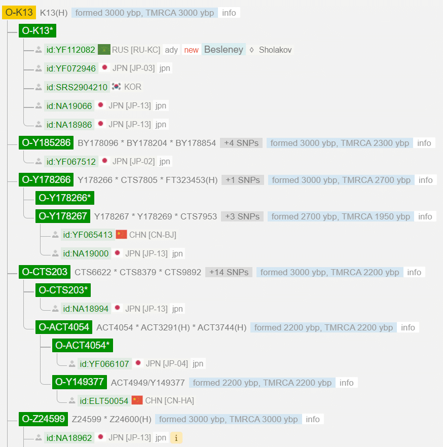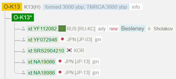 В линию K13 попадают в основном японцы, меньше корейцев и китайцев. Шолаков по отношению к ним всем находится на дистанции 3000 лет. Шолаков попадает в ветку обозначенную звездочкой (O-K13*). Это означает, что все более глубокие снипы K13 у него отсутствуют. Сама K13 включает ряд таких веток, образованные более близкими между собой результатами: