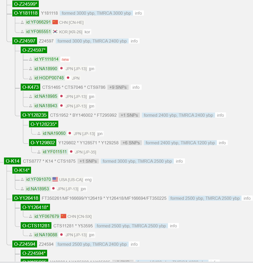 Adam > A0-T > A1 > A1b > BT > CT > CF > F > GHIJK > HIJK > IJK > K > K2 > K-M2308 > K-M2335 > NO > O > F265 > M268 > P49 > F1658 > CTS9259 > K10 > 47Z (O1b2a1a1) > K2 > K13