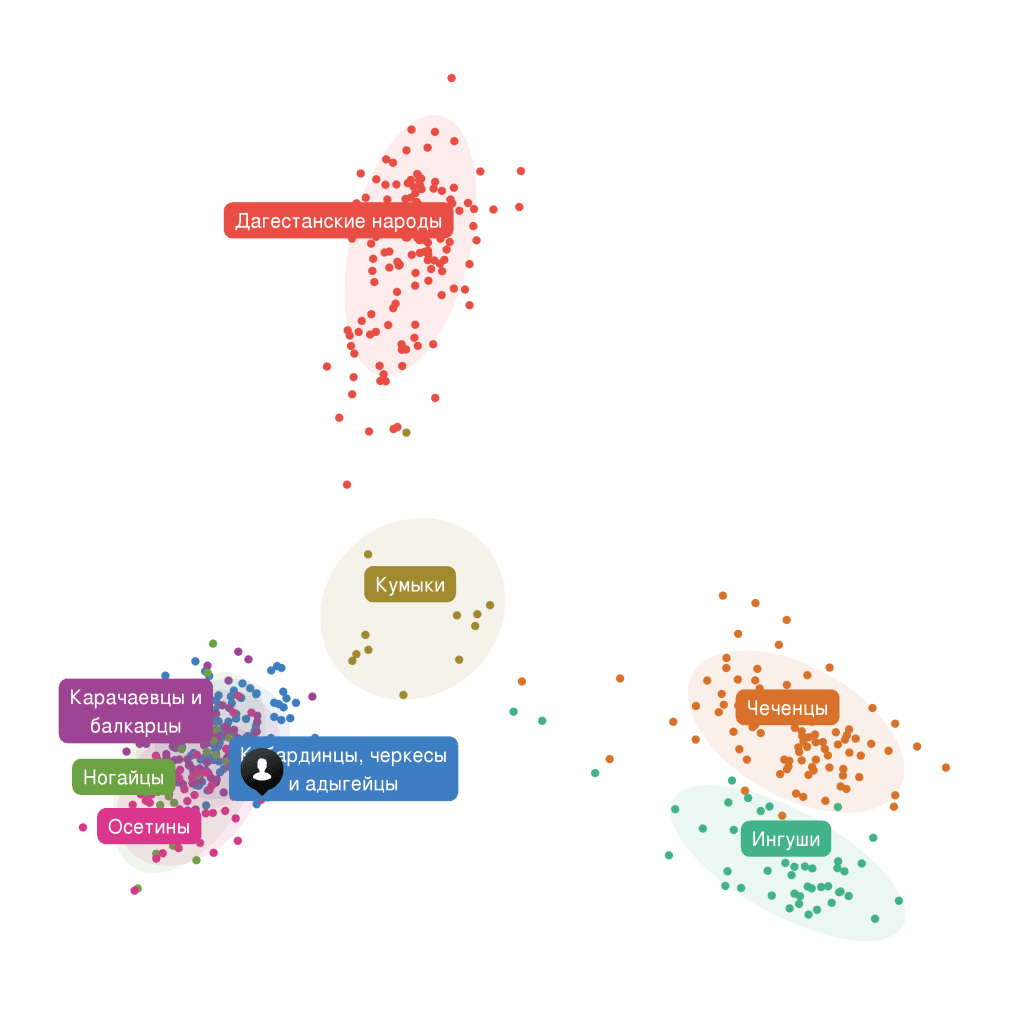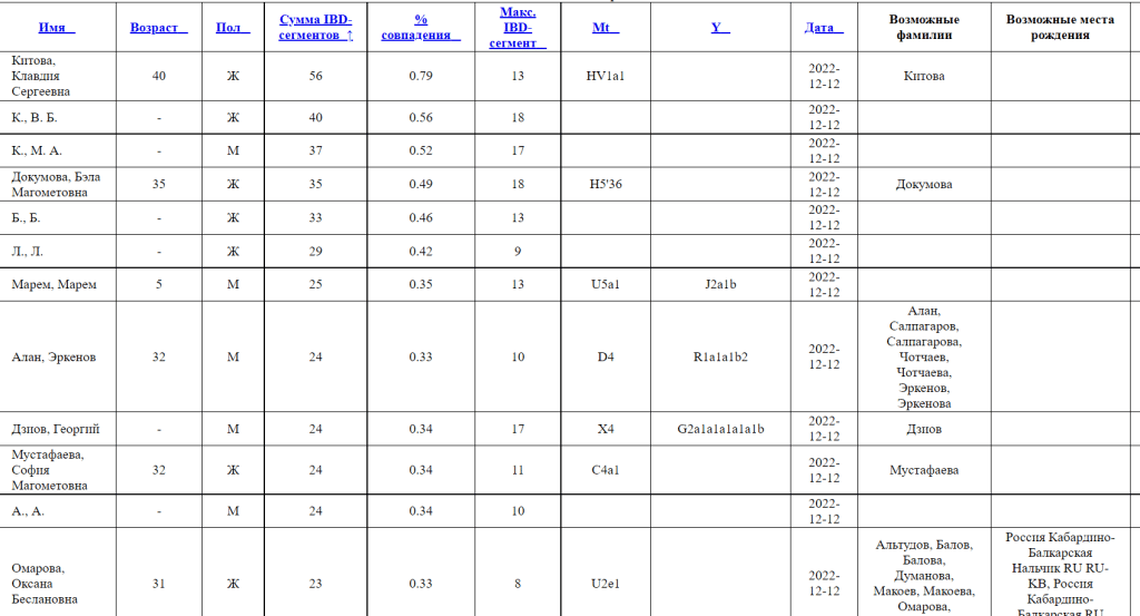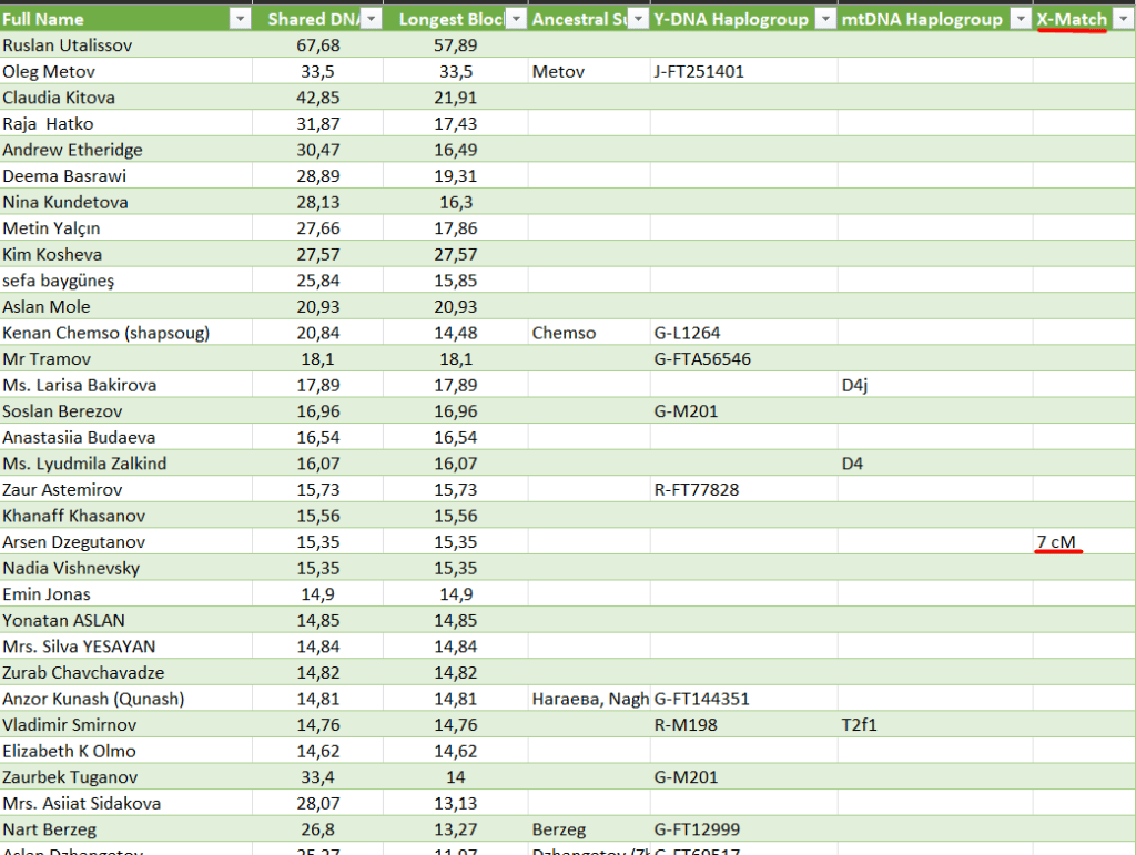 Самое близкое совпадение с ногайцем Уталисовым, родство на уровне 6-7 поколений.