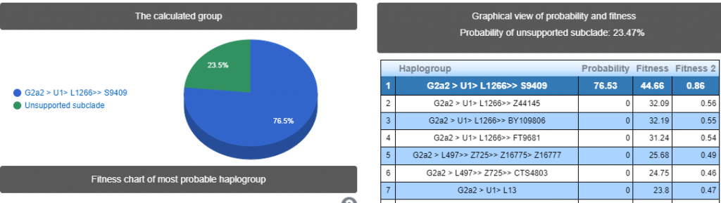 Выявлена гаплогруппа G2a2. Субклад G-L1264 >> S9409 >> FT389102
