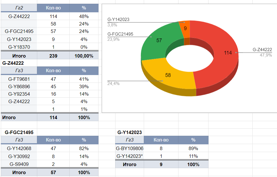 G-L1264 делится на 3 ветки. Самая крупная G-Z44222, затем идет G-FGC21495 и самая малочисленная G-Y142023. Время образования этих ветвей 3-4 тыс. лет назад.