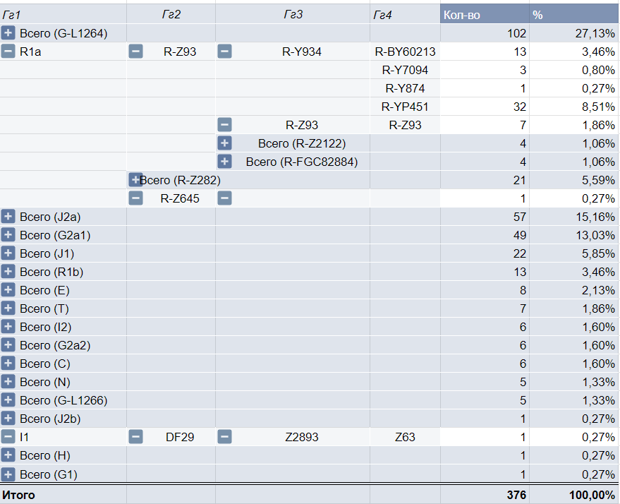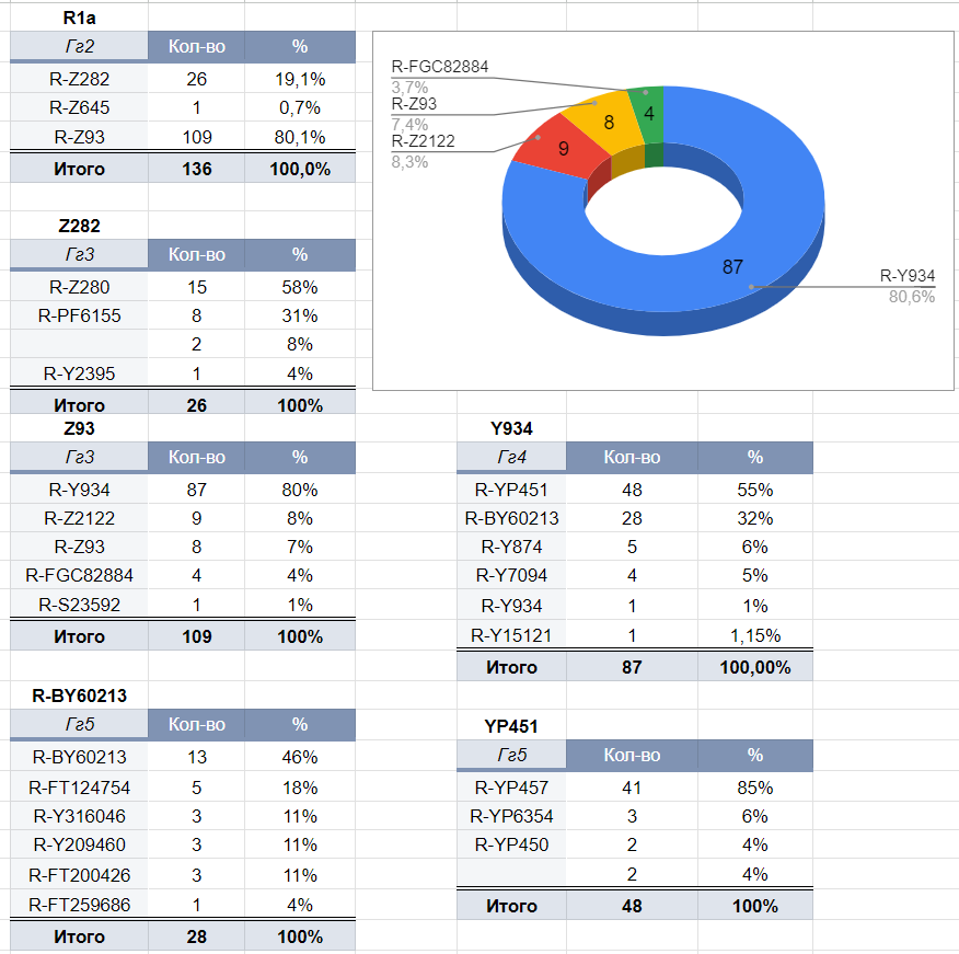 В свою очередь около 80% R-Z93 относятся к R-Y934. Почти около 60% R-Y934 принадлежат к R-YP451. Около 30% к R-BY60213.