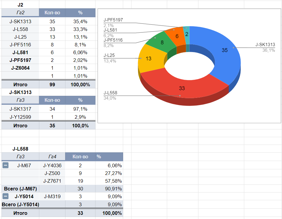 Как уже выше отмечалось, J2 гораздо имеет гораздо более разрозненную структуру. Самая крупная линия — J-SK1313. Это древнейшая линия обнаружена на Кавказе около 12 тыс. лет назад. Почти все наши J-SK1313 попадают в J-SK1317, с возрастом жизни общего предка +- 5000 лет.