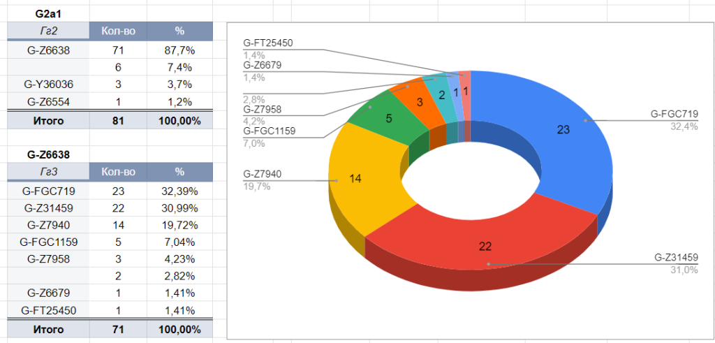 Почти все из наших G2a1 также имеют общего предка в диапазоне 5000 лет. Почти 90% из них относятся к G-Z6638. 3 крупнейшие линии G-Z6638: