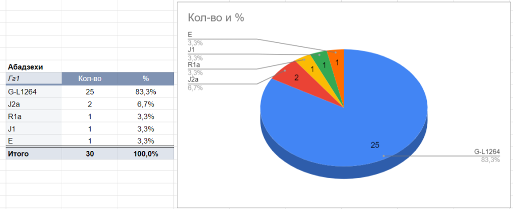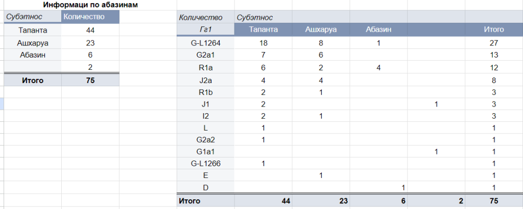 G-FGC719 — преимущественно G-FT187743, с возрастом до общего предка ~ 3000 лет. Большая часть абазины ашхарцы;