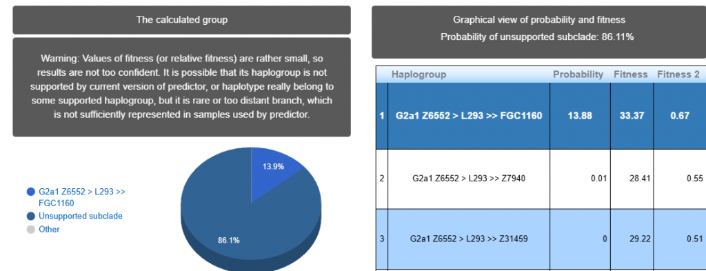 Исследовано 37 маркеров в лаборатории YSEQ. Выявлена гаплогруппа G2a1. Наиболее вероятный субклад Z7940.