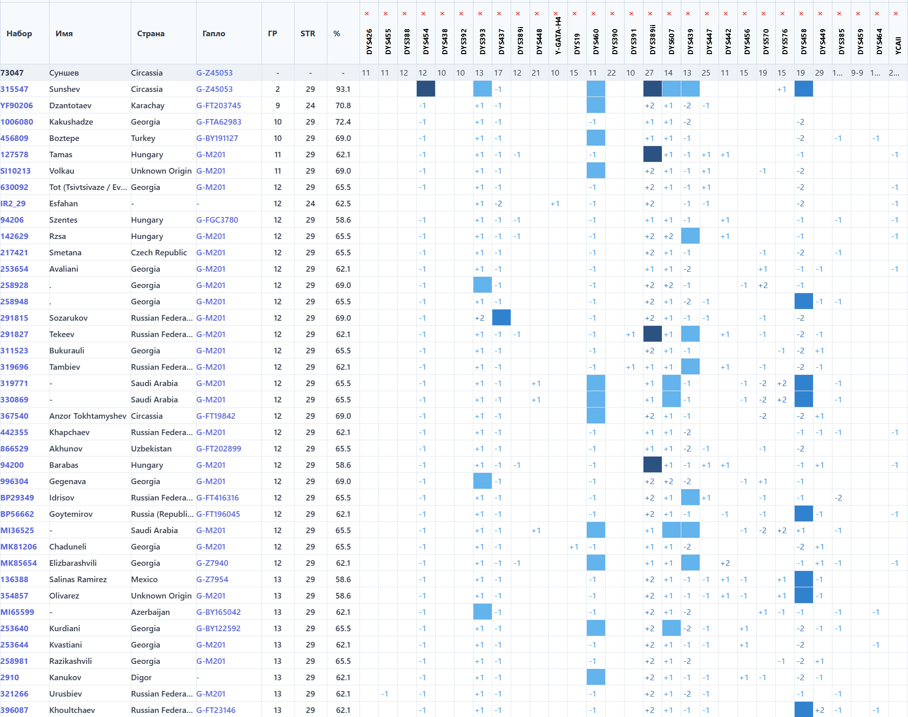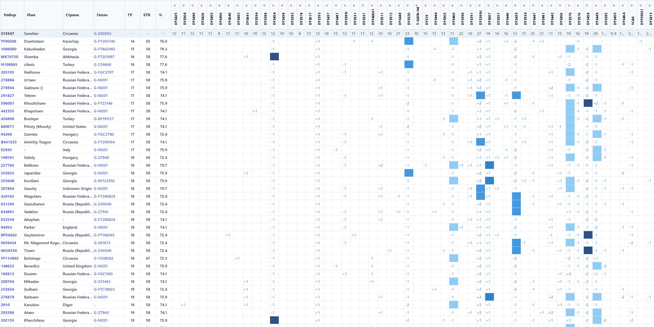 У Суншевых из Алтуда и Урвани совпадающий результат. Гаплогруппа G2a1. G2a1 самая распространенная на Центральном Кавказе. Встречается у многих Кавказских народов. Чаще всего G2a1 называют наследниками Кобанской культуры.