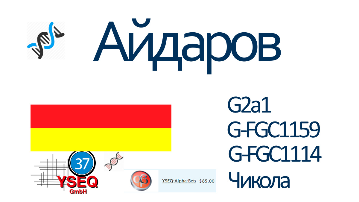 Фамилия: ДаловСубэтнос: КабардинецНаселенный пункт: с. Куба, КБРГаплогруппа: G2a1 > G-Z45053По результатом теста обнаружено потенциально близкое совпадение с абазином Пшмаховым. Исследовано 37 маркеров в лаборатории FTDNA. Гаплогруппа G2a1. Наиболее глубокая вероятная линия G-Z45053 Полная ссылка: G-Z6552 -> G-Y34352 -> G-Z6553 -> G-Z6744 -> G-Z6653 -> G-Z6702 -> G-Z6679 -> G-Z6692 -> G-Z6706 -> G-Z6638 -> G-Z6654 -> G-FGC671 -> G-FGC713 -> G-FGC701 -> G-Z7958 -> G-FGC750 -> G-Z31459 -> G-Y36736 -> G-Z31461 -> G-Z45053 Y37