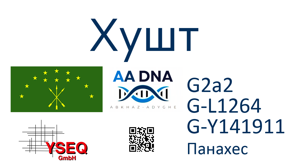 Фамилия: ХуштНациональность: Адыг (Шапсуг)Населенный пункт: ПанахесГаплогруппа: G2a2 >> L1264 >> Y141911 Протестированный происходит из предгорных шапсугов. Родословная: Хагуч > Юсуф > Барич > Руслан Сделано Y37 маркеров в YSEQ, выявлена гаплогруппа G2a2-L1264 Субклад — G-Y141911 Без CDY&DYS464