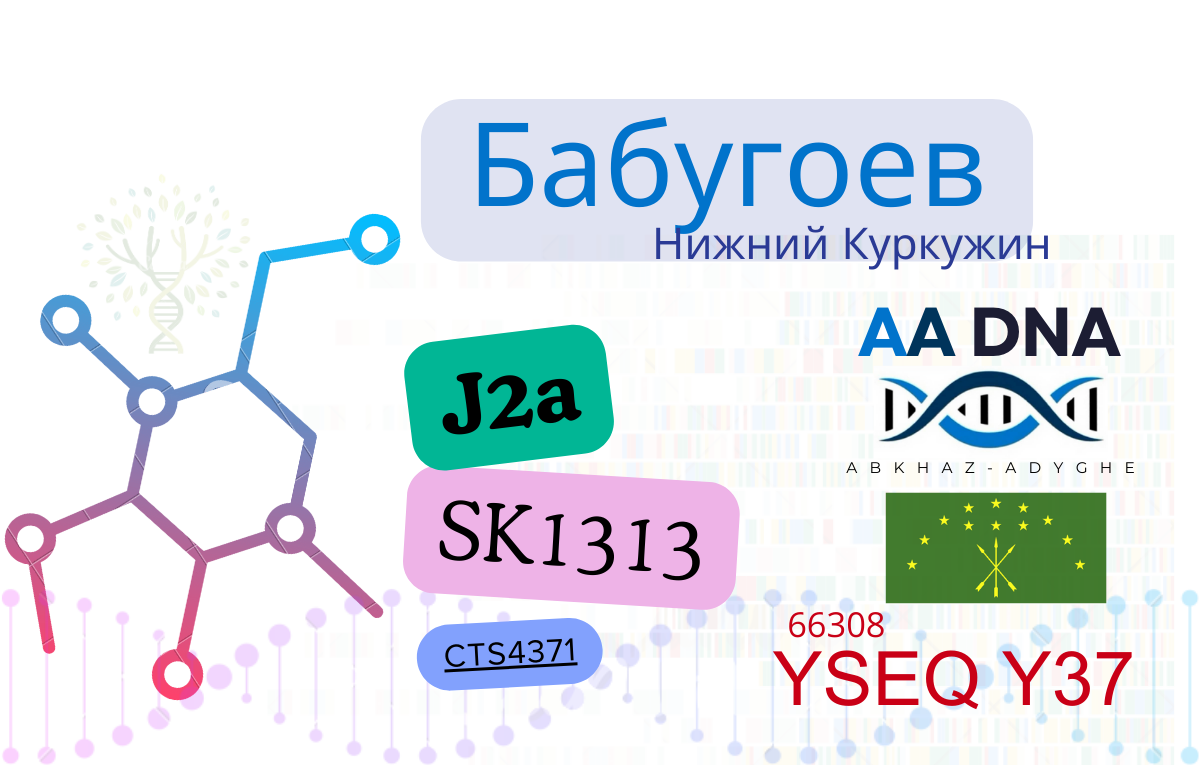 Фамилия: Тарба (Ҭарба)Субэтнос: Абхаз (бзыпец)Населенный пункт: Дурипш (Дәрыҧшь)Гаплогруппа: J2a >> SK1317 >> Y26650 История Род Тарба один из самых многочисленных в Абхазии, распространен в большинстве сел Абжуйской и Бзыпской Абхазии, а также в Самурзакане и среди абхазской диаспоры Турции. Протестированный относится к патронимии (абиԥара) Чқәыл-иԥацәа (Потомки Чкулаа) из села Дәрыҧшь Бзыпской Абхазии. РодословнаяПолная родословная сдавшего: … Читать далее