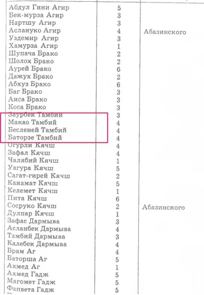 Цугба, Квачба, Харбузов, Ныров, Дармилов (одна из линий Дармиловых), Жиба, Цикисов, Лахов, Бижев, Озов (одна из линий Озовых), Гопшев, Докумов, Урусов. При этом ветка явно тяготеет к абазинам и абхазам. Глубокий тест есть только у Урусова (Нартан).