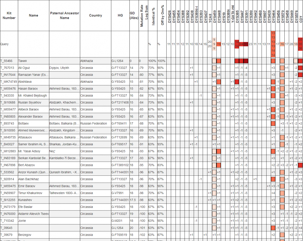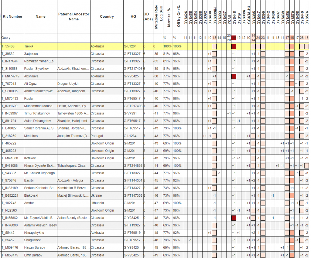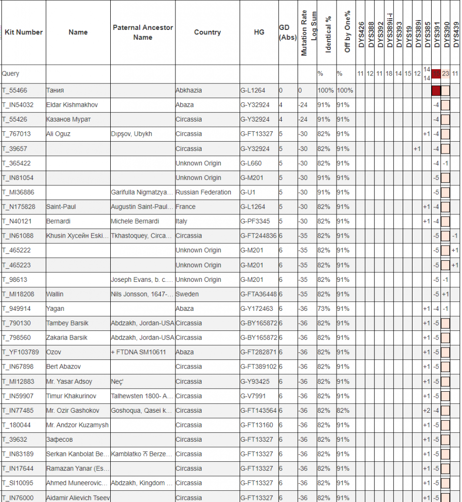 Очень большая дистанция до ближайших совпаденцев. Ряд маркеров очень сильно отличаются, например DYS391. Уникальная мутация. Следующий скриншот без учета этих редких маркеров.