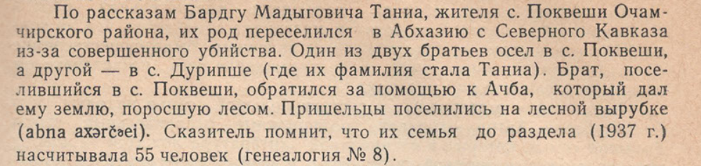 Бардгу Мардыгович Тания (ныне покойный старейшина рода) рассказывал о корне фамилии то, что они — с Красной поляны. Трое братьев переселились в Абхазию. Первый остался в Гудаутской части (село Дурипш), второй был убит в Кодорском ущелье, третьий пустил корни в селе Пакуаш (Ԥақәашь) Очамчырского района (Абжуа), где он попросил землю у главенствующих там князей Ачба, которые дали ему землю поросшую лесом.