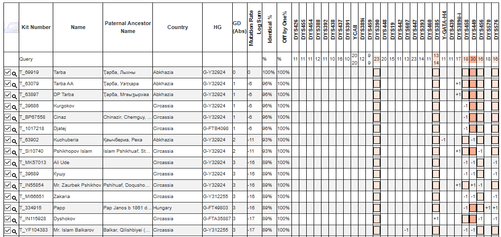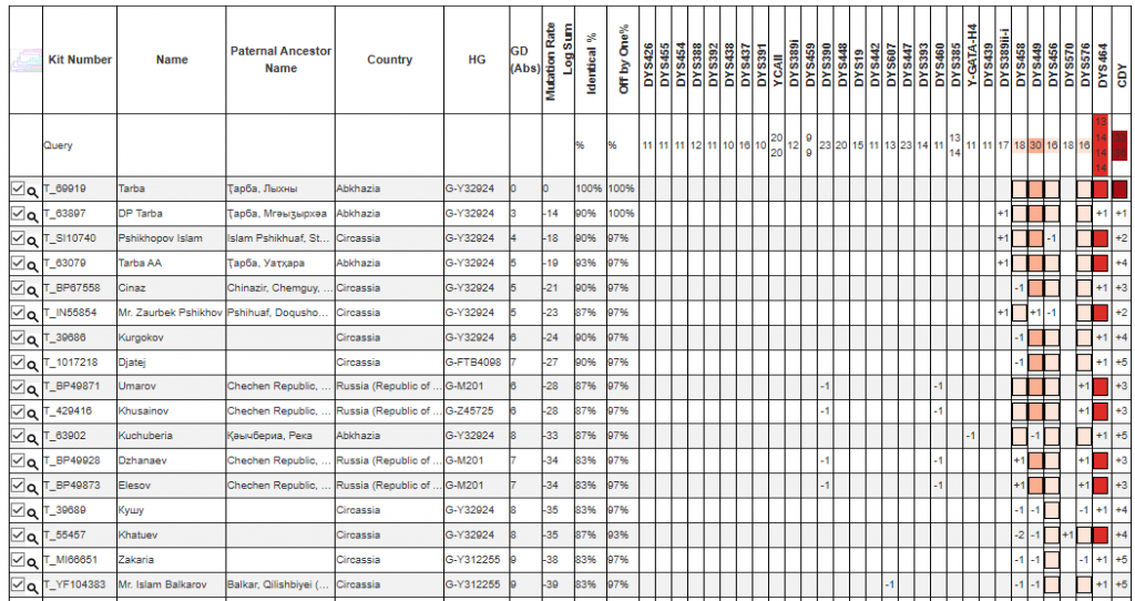 Род Тарба один из самых многочисленных в Абхазии, распространен в большинстве сел Абжуйской и Бзыпской Абхазии, а также среди абхазской диаспоры Турции. Протестированный относится к патронимии (абиԥара) Бақьас-иԥа. Ветвь протестированного вышла из Мгудзырхуа и осела в селе Хуап, откуда затем спустилась в Лыхны, поселок (аҳабла) Мазихуа (Мазихәа).