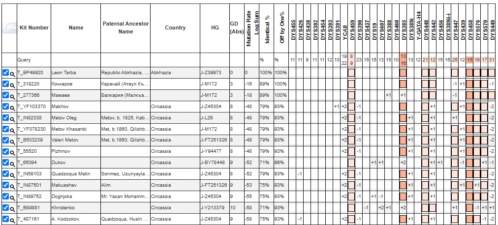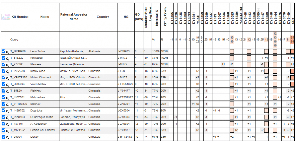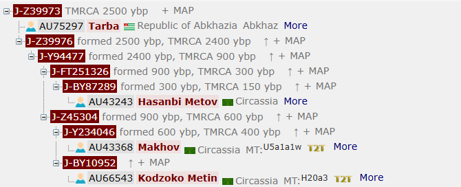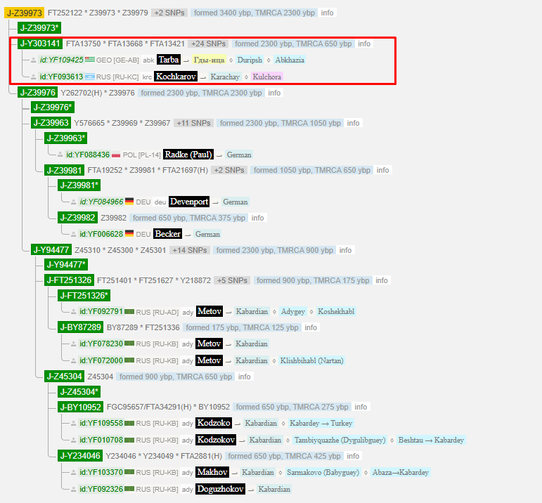 Тарба сгруппировался с Карачаевцем Кочкаровым. Общий предок обоих жил 650 лет тому назад. На один уровень глубже расположена ветка Z39976. Дистанция до общего предка ~ 2300 лет. Субклад состоит и германцев (польский образец по отцовской линии из Австрии) и кабардинцев. Между собой 2 эти линии ближе чем с абхазско-карачаевской линией. Вероятнее всего истоки всей линии Z39973 связаны с Кавказом уже более 3х тысяч лет. Ряд адыгских фамилий попадающие в эту ветвь: Метов, Кодзоков, Махов, Догужоков, Пижинов, Шаков, Бекшоков, Макуашев. Так же в данной ветви было найдено древнее захоронение гота.