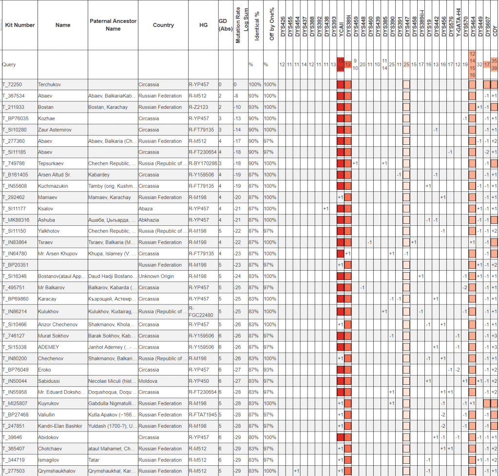 У Терчукова выявленна одна ветвь гаплогруппы R1a часто встречающаяся у кабардинцев. В том числе у таких известных фамилий как Атажукин (одна из линий Атажукиных), Абаев, Астемиров, Бабуг, Докшоков, Карамурзин, Кудайнетов итд.