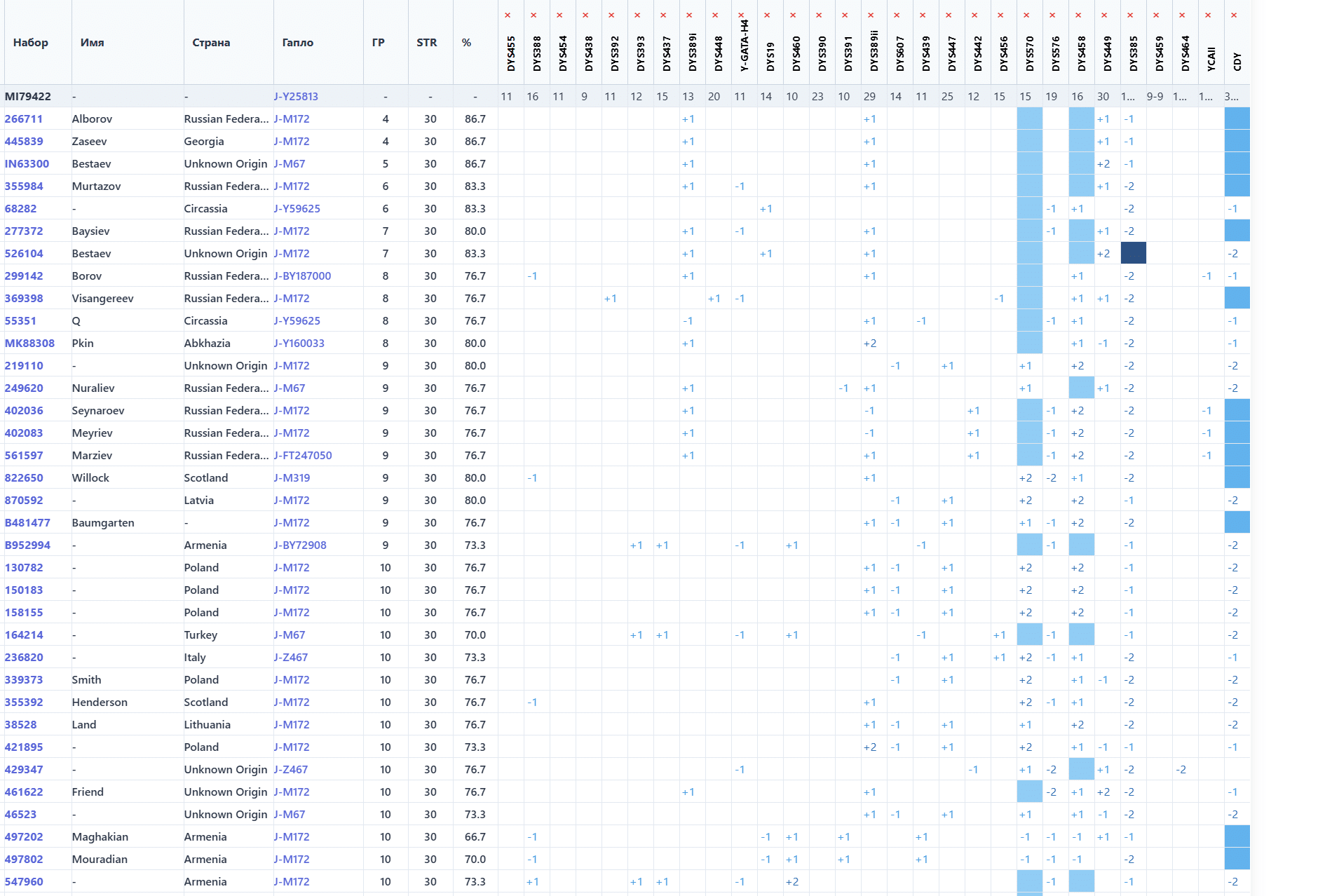 Поиск STR-совпадений в базе STR Match Finder помогает найти потенциальных родственников по мужской линии среди других протестированных из той же популяции. Мерой близости при этом служит генетическая дистанция, зависящая от числа мутационных различий