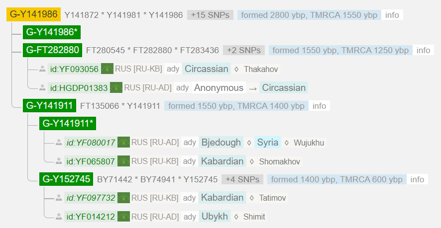 Непосредственно ветка Тхакахова G-Y141986 образовалась спустя еще 1200 лет. Общий предок всех представителей субклада — 1600 лет.+- По результатам глубоких тестов туда попали: