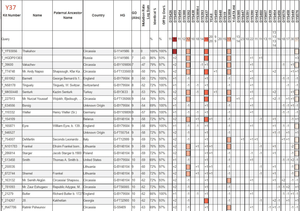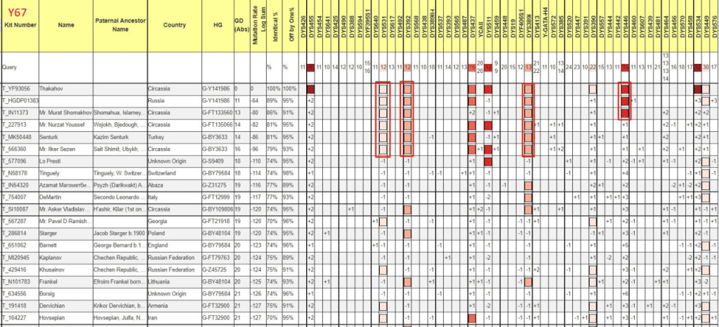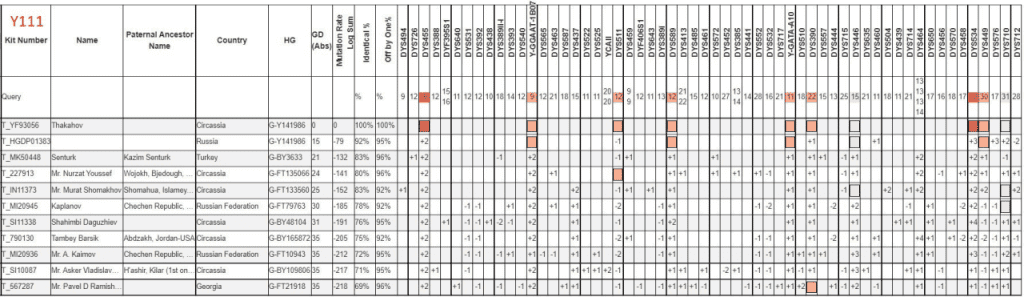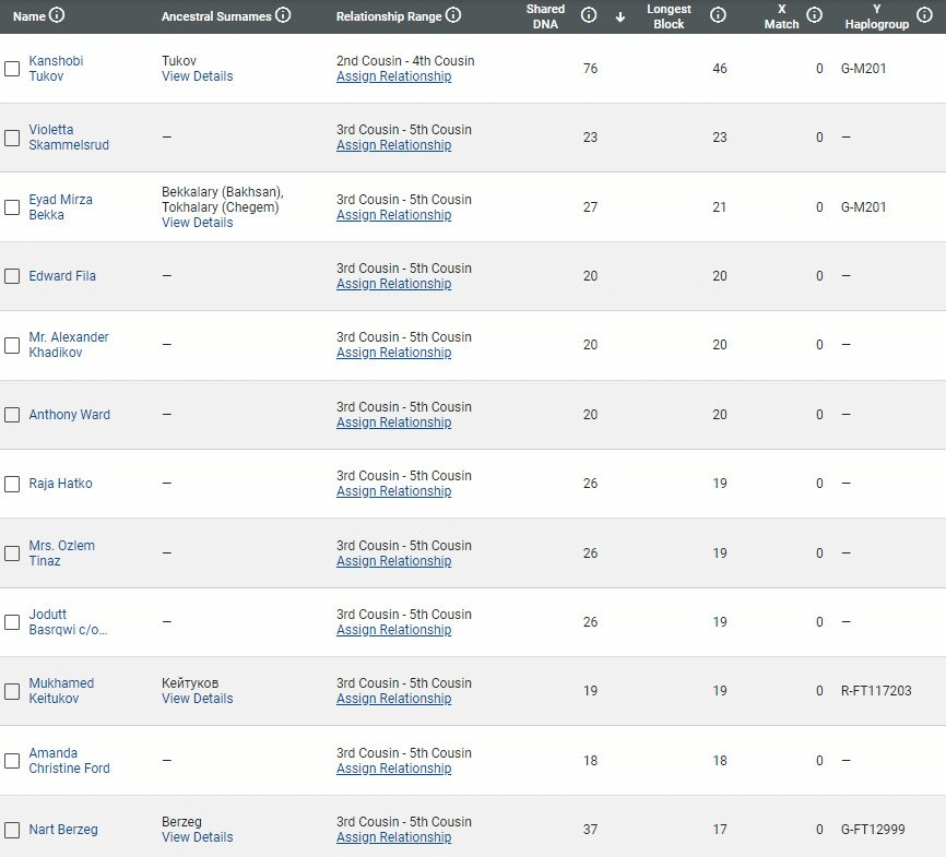 По базе FTDNA значительное совпадение только с Кабардинцем Туковым (по преданию Туковы из Нартана происходят из Моздокских Кабардинцев). Общее совпадение 76 сМ а самый большой участок — 46 сМ. Вероятное родство на уровне 4-6 поколений.