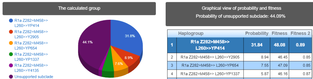 Nevgen уверенно прогнозирует субклад L260. Наиболее вероятная линия внутри L260 — YP414
