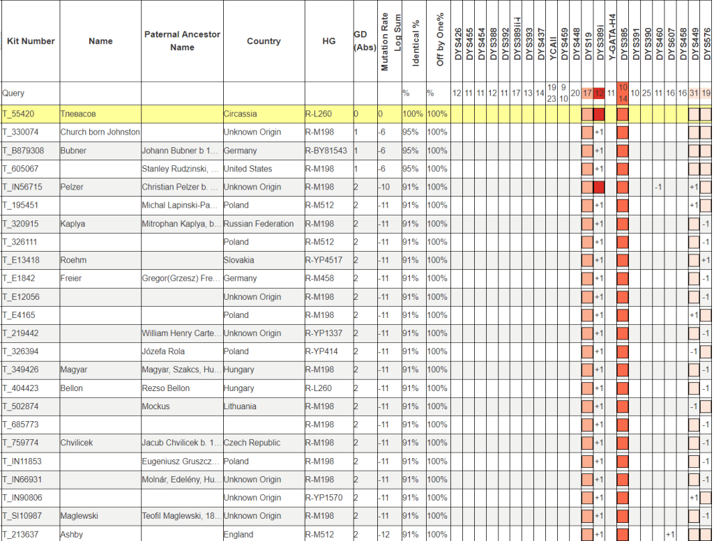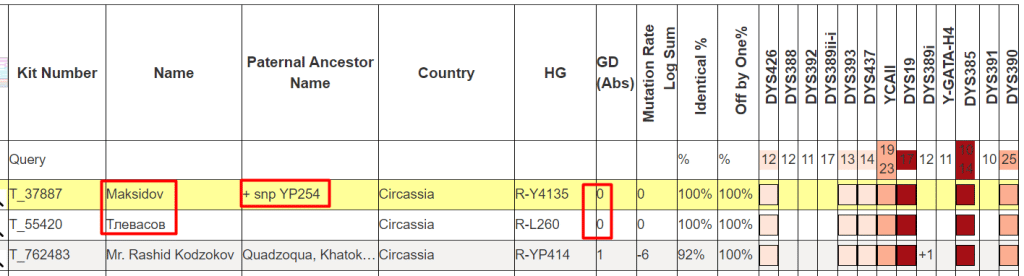 При сравнении по 18 маркерам Тлевасов полностью совпадает с Максидовым из с. Хамидие. У последнего тест только на 18 маркеров. При этом у Максидова есть положительный SNP тест на субклад YP254. Это предковая линия к субкладу YP414, который предсказывается Nevgen.