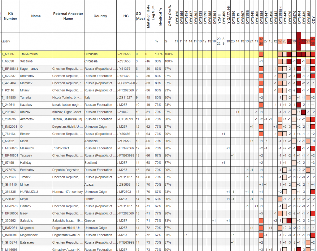 Поиск STR-совпадений в базе STR Match Finder помогает найти потенциальных родственников по мужской линии среди других протестированных из той же популяции. Мерой близости при этом служит генетическая дистанция, зависящая от числа мутационных различий