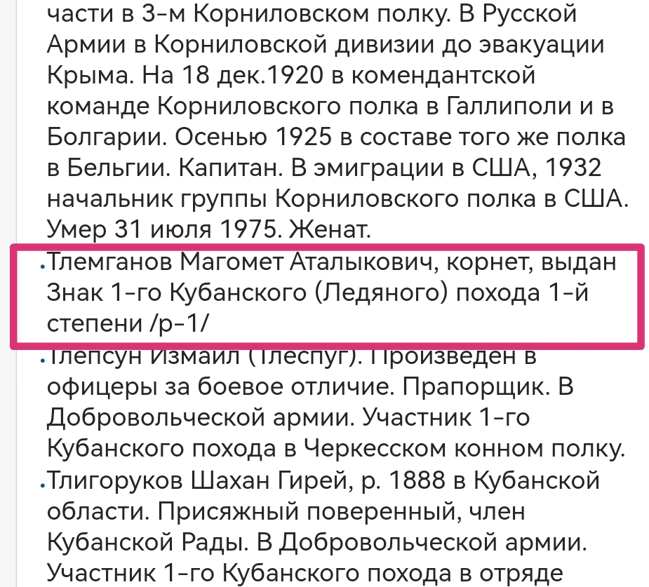 В документально исторической литературе упоминается представитель рода Магомет Тлимиганов- всадник Черкесского конного полка Кавказской туземной дивизии, который являлся участником первого Кубанского (Ледяного похода)