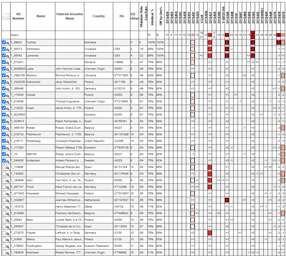 Поиск STR-совпадений в базе STR Match Finder помогает найти потенциальных родственников по мужской линии среди других протестированных из той же популяции. Мерой близости при этом служит генетическая дистанция, зависящая от числа мутационных различий