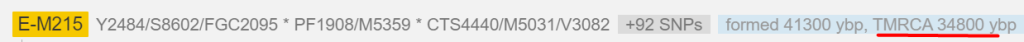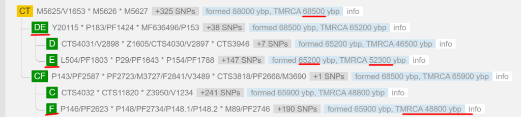 DE — общая линия гаплогрупп D и E. Он отделелись от остальных 88 тыс. лет назад. Между собой разделилсь 65 тыс. лет назад.