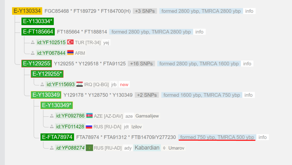 В одной ветке с Умаровым кабардинец Торчоков (результаты скрыты). Дистанция до последнего общего предка ~ 500 лет. Чуть выше расположились горский еврей Изилов и азербайджанец Гамсалиев. До их общего предка с Умаровым и Торчоковым ~ 750 лет.