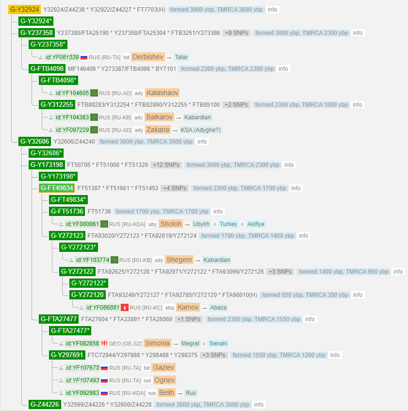 Интересно отметить, что Y32924 в большей степени распространена на Востоке, у кабардинцев, тюркских народов итд. На Западной Кавказе преимущественно распространены другие линию G-L1264.