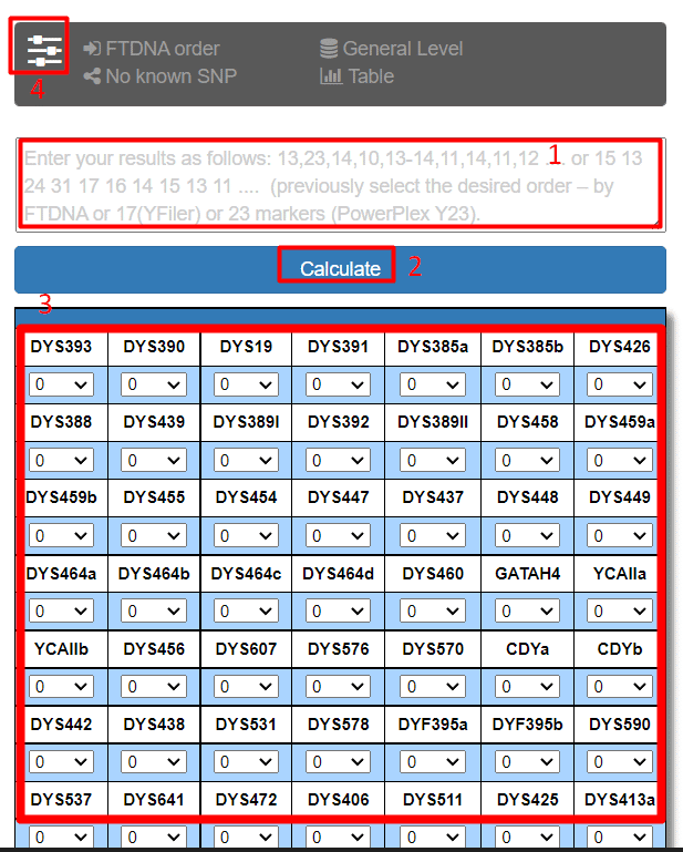 В поле обозначенное цифрой 1 необходимо скопировать набор маркеров, немного подождать пока заполнится цифрами область обозначенная цифрой 3 и нажать кнопку Calculate. На скриншоте ниже пример заполненный