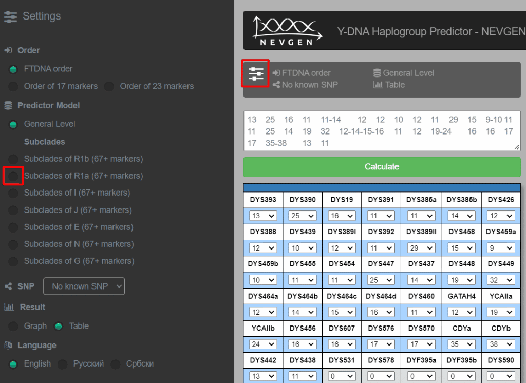 На этом примере калькулятор предсказал только гаплогруппу. Со 100% вероятностью предсказана гаплогруппа R1a. Теперь когда мы знаем гаплогруппу мы можем переключить Nevgen в режим работы по конкретной гаплогруппе. Для этого надо нажать на настройки (цифра 4 на первом скриншоте).