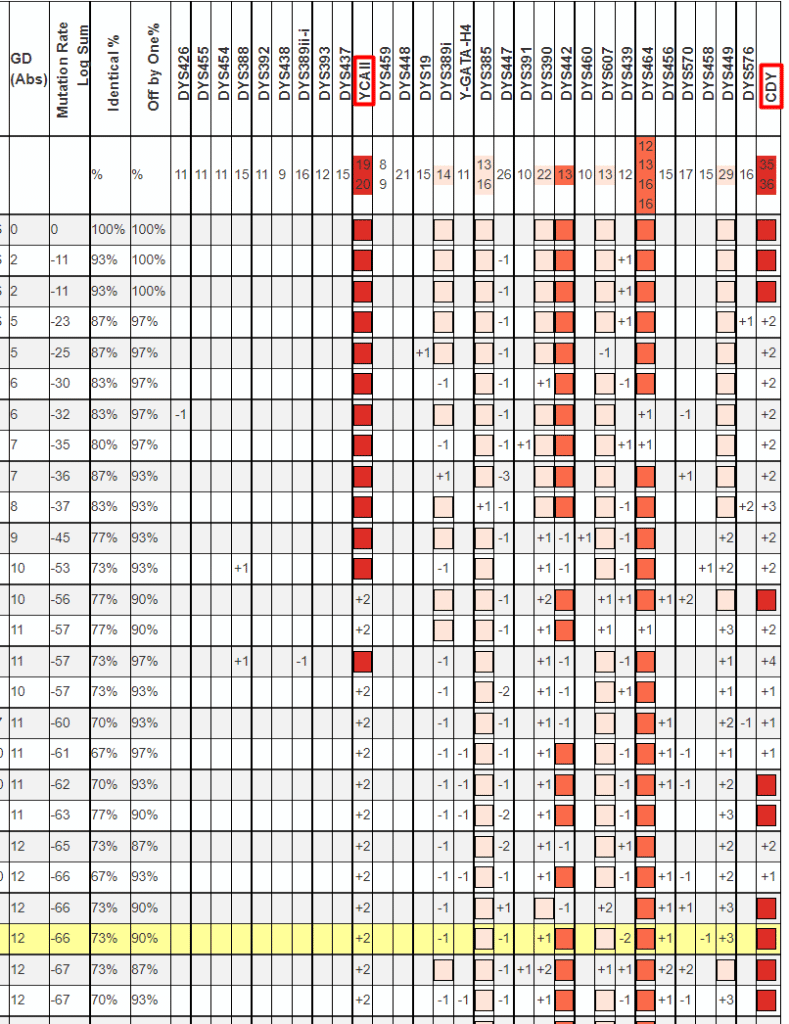 По картинке хорошо заметна группа близких между собой результатов. Первые 3 с GD = 2 (первый столбец) это представители одной фамилии. У них генетическая дистанция маленькая и также самый последний маркер (CDY) одинаковый. Это говорит о близком родстве. CDY это самый быстро меняющийся маркер и когда значения этого маркера совпадаю у тех у кого дистанция по маркерам не сильно большая, то это говорит о близком родстве. В противовес этому стоит обратить в внимание на нижние строки. Там дистанция по маркерам составляет 11-12 шагов и CDY тоже одинаковый. Здесь наоборот, CDY случайно совпал, при такой большой дистанции такой маркер лучше вообще убрать из сравнения (удалив его из заполненной таблицы на сайте STR Match Finder).