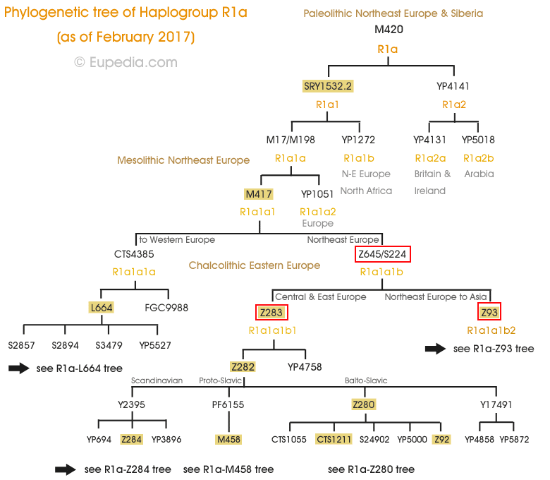 Гаплогруппа R1a одна из крупнейших по численности. Она состоит из множества больших веток. Некоторые из них распространены в Восточной Европе, среди славян, балтов, германцев итд.