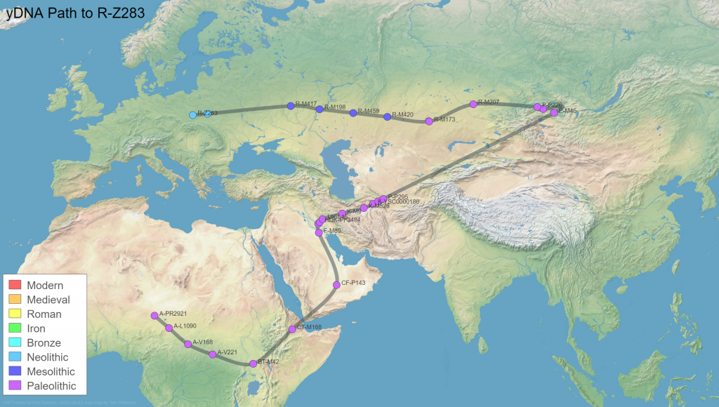 Adam > A0-T > A1 > A1b > BT > CT > CF > F > GHIJK > HIJK > IJK > K > K2 > K2b > P > P-V1651 > P-M1254 > P-P337 > P-P284 > P-P226 > R > R-Y482 > R1 > R1a > M459 > M735 > M198 > M417 > Z645