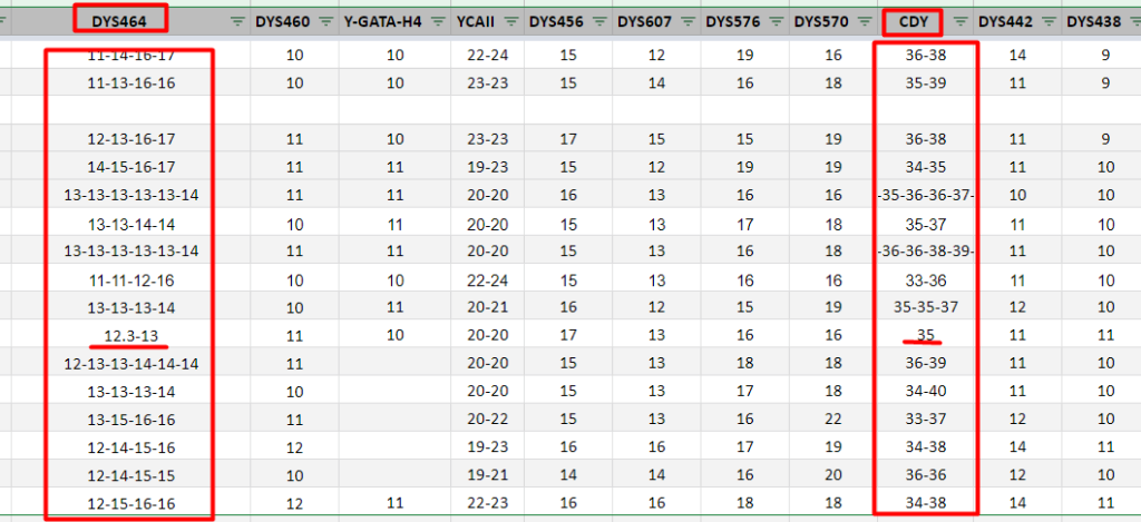 По 37 маркерам тоже нет близких совпадений. По картинке заметно, что сразу несколько редких мутаций у Зафесова. В первую очередь это полиндромные маркеры. Полиндромы это маркеры которые состоят из нескольких цифр. Например самый последний маркер CDY у Зафесова превратился из полиндромного в обычный. Тоже самое DYS464, вместо 4х повторов у Зафесова всего 2. Для сравнения приведем скриншот, как обычно выглядят эти маркеры.