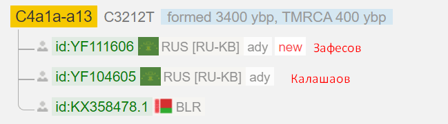 В эту линию попадают кроме Зафесова еще и Калашаов. Дистанция до их общего предка по материнским линий ~ 400 лет.