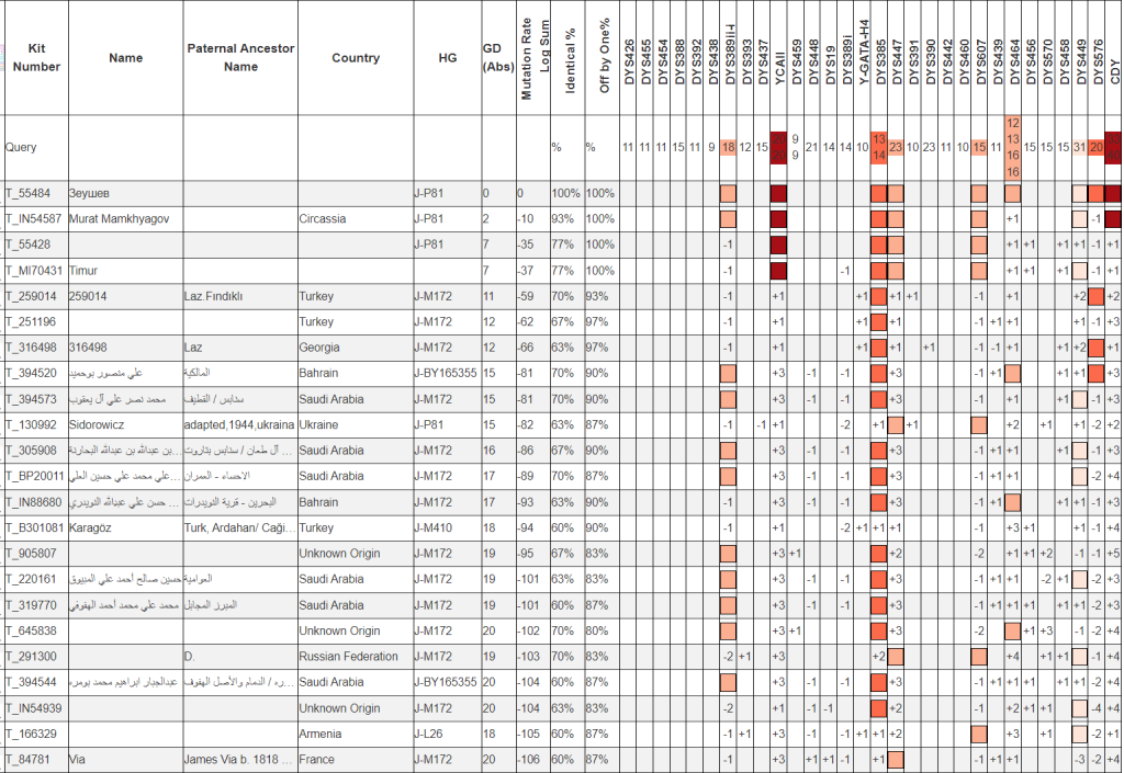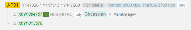 На древе Yfull пока здесь только 2 образца. Кабардинец Мамхягов из а. Жако и усыновленный украинец. Между ними дистанция ~ 3700 лет.