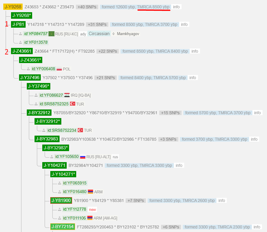 Дистанция до последнего общего предка Y9268 ~ 8500 лет. На этом уровне мы уже можем предположить, что ветки уже оказались на Кавказе.